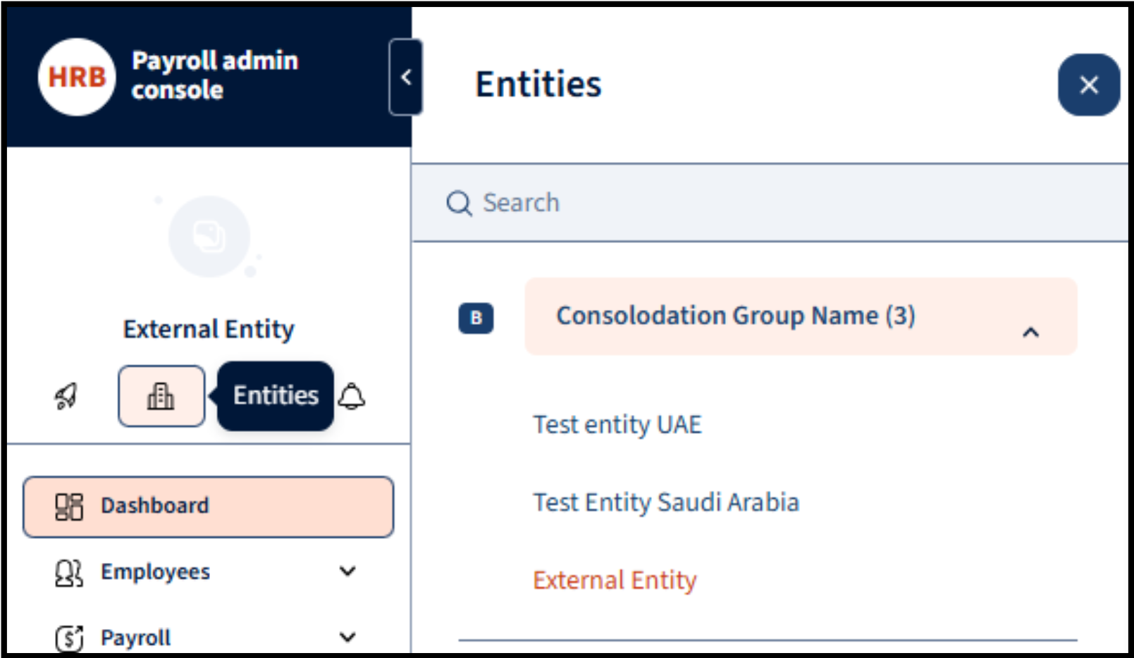 - Click on the “Entities” button (represented by the 🏦 building icon) and select the specific entity where the external user needs approval rights.