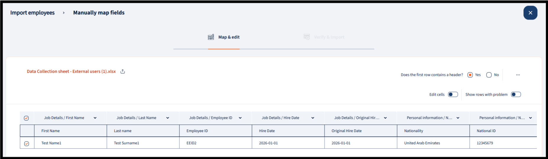 - Option A: Bulk Import. Select “Import employee data”. You will be prompted to upload your completed data collection sheet and map the required fields (such as First Name, Last Name, Employee ID, Hire Date, and Nationality) to the system.