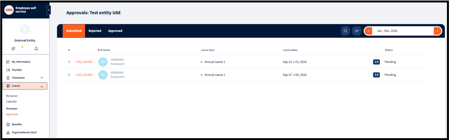 - To action these requests, the external user must navigate to the specific module (e.g., Leaves), click on Reviewer, and then select Approvals.
